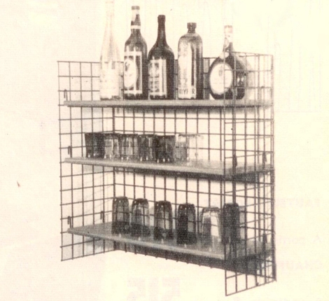 Il s'agit d'un système d'étagères suspendues, formé par des treillis métalliques auxquels sont accrochés des crochets en fils d'acier supportant les tablettes.