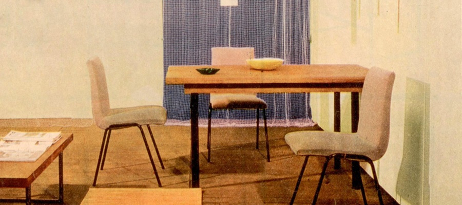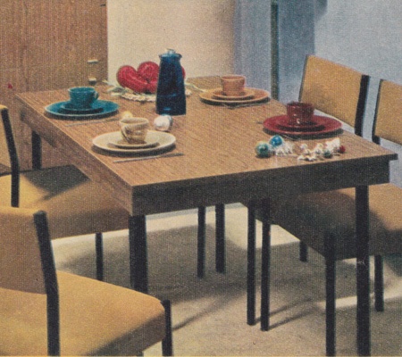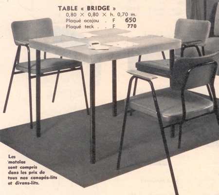 Petite table de cuisine, 60x100cm pour la TR28, 70x110cm pour la TR38, plateau plaqué bois (jusqu'en 1964) ou recouvert de formica.