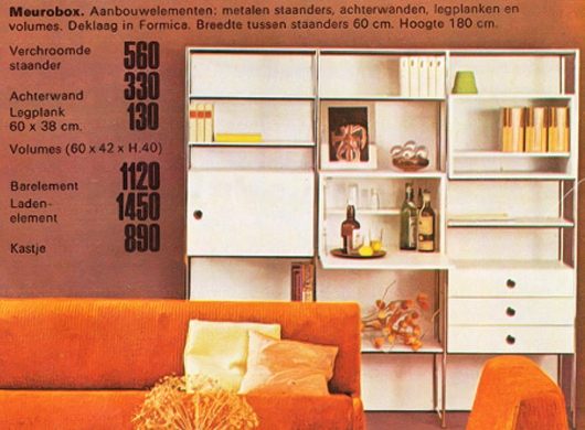 En 1973, toujours suivant le même sytème, "Meurobox" apparait aux catalogues : retour à largeur de 60cm, mais 42cm de haut seulement pour chaque caisson, disponible en une porte, une porte "bar" ou 3 tiroirs.