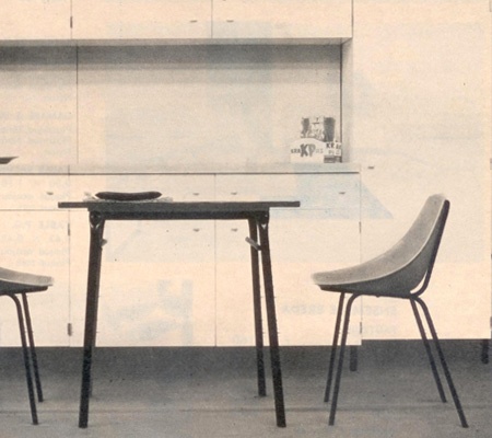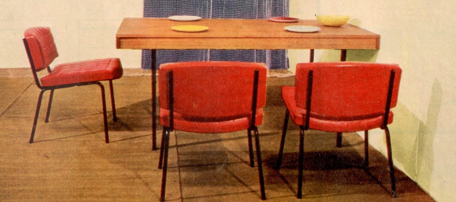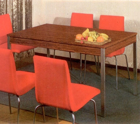 Petite table de cuisine, 60x100cm pour la TR28, 70x110cm pour la TR38, plateau plaqué bois (jusqu'en 1964) ou recouvert de formica.